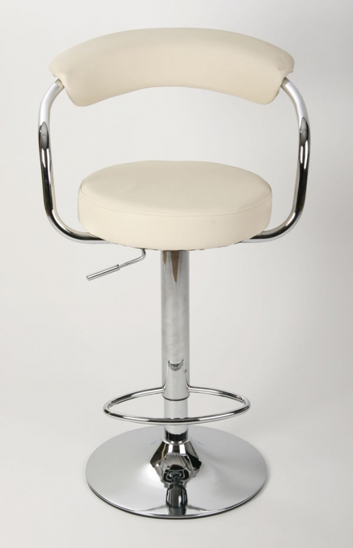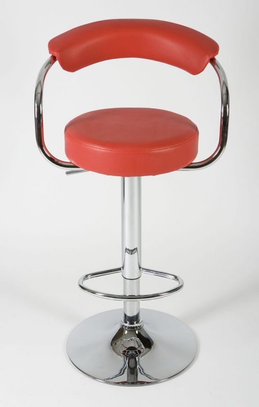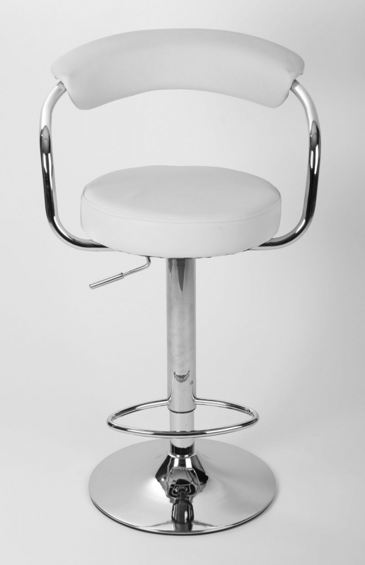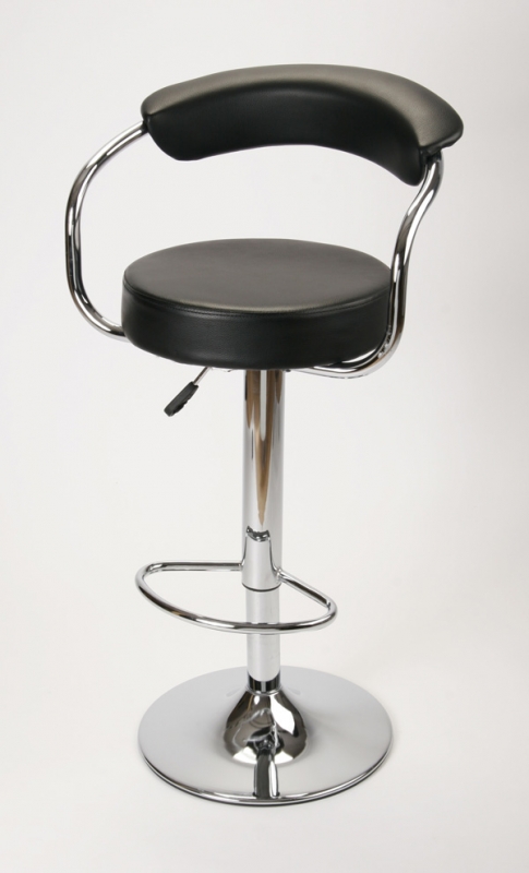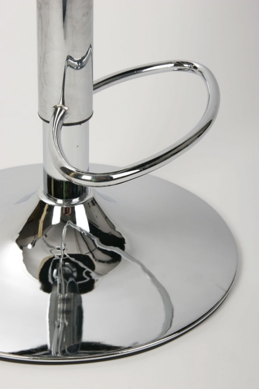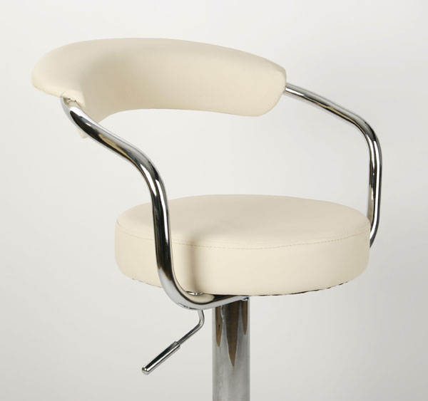Barová židle v klasickém designu s opěradlem zad a opěrkami rukou. Sedák i opěrák jsou připevněny na společném kovovém rámu, který díky svému tvaru současně vytváří také opěrku rukou. Kovová podnož i rám barové židle jsou chromované. Syntetická kůže na sedáku a opěráku je snadno udržovatelná. Barová židle je otočná o 360° a výskově stavitelná. Vzhledem k jejímu zaoblenému tvaru k ní budete chtít vybrat barový stůl s kulatou stolovou deskou.