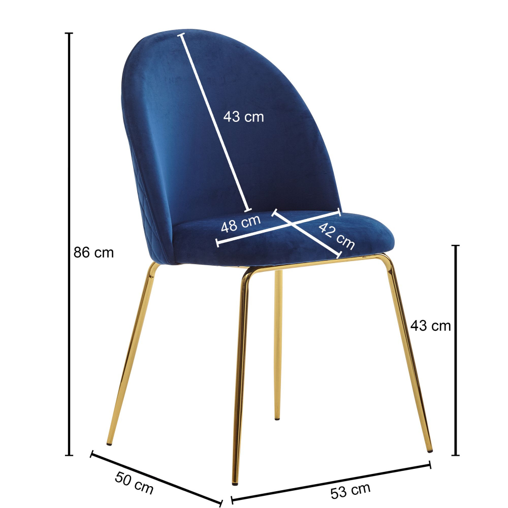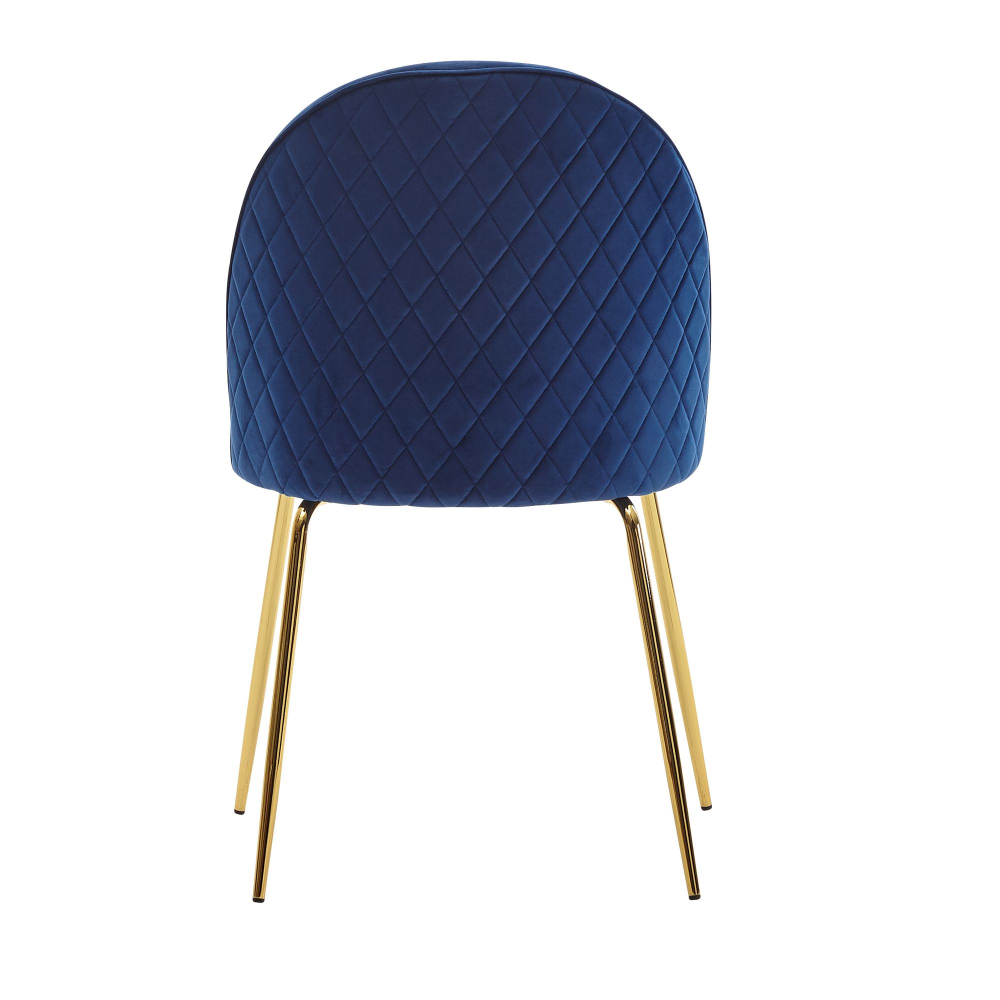 Moderní designová židle Selen s tvarovaným, prošívaným sedákem ze sametu v modré barvě. Perfektní stabilitu zajišťuje kovová podnož ve zlaté barvě. Tato stylová židle se perfektně hodí do moderních interiérů.