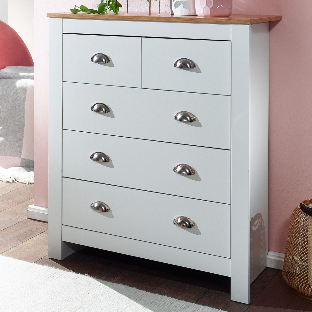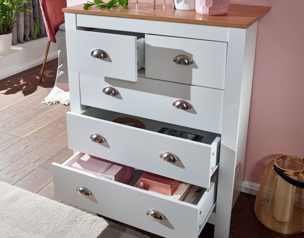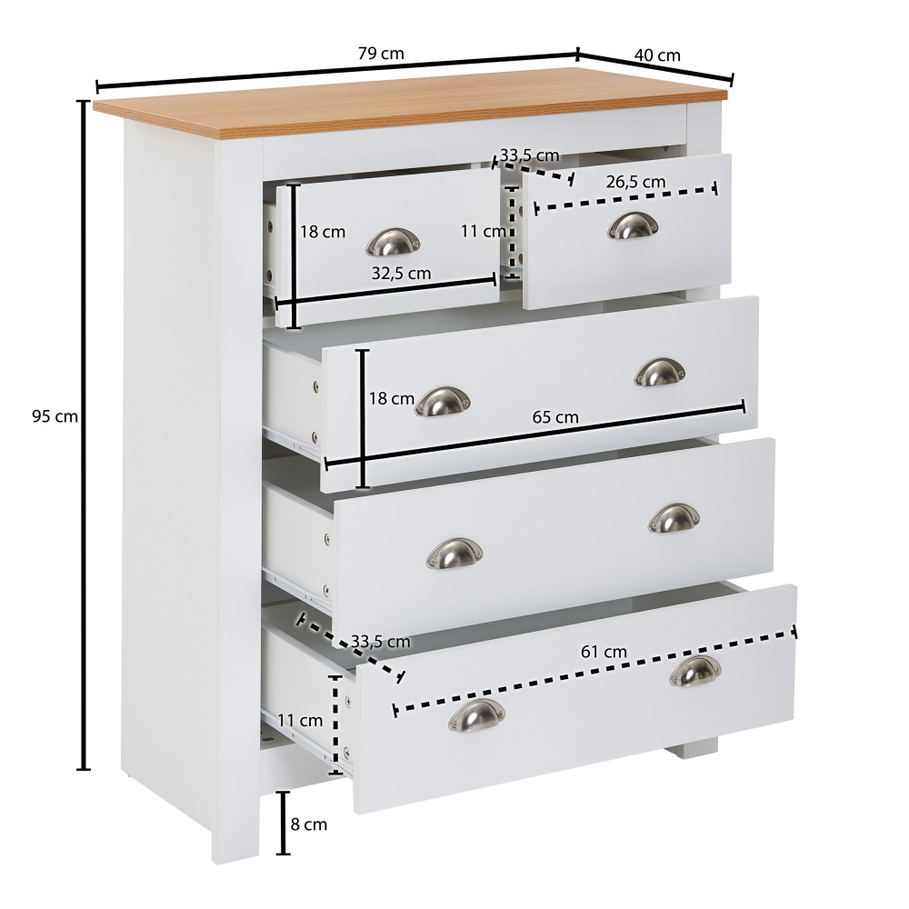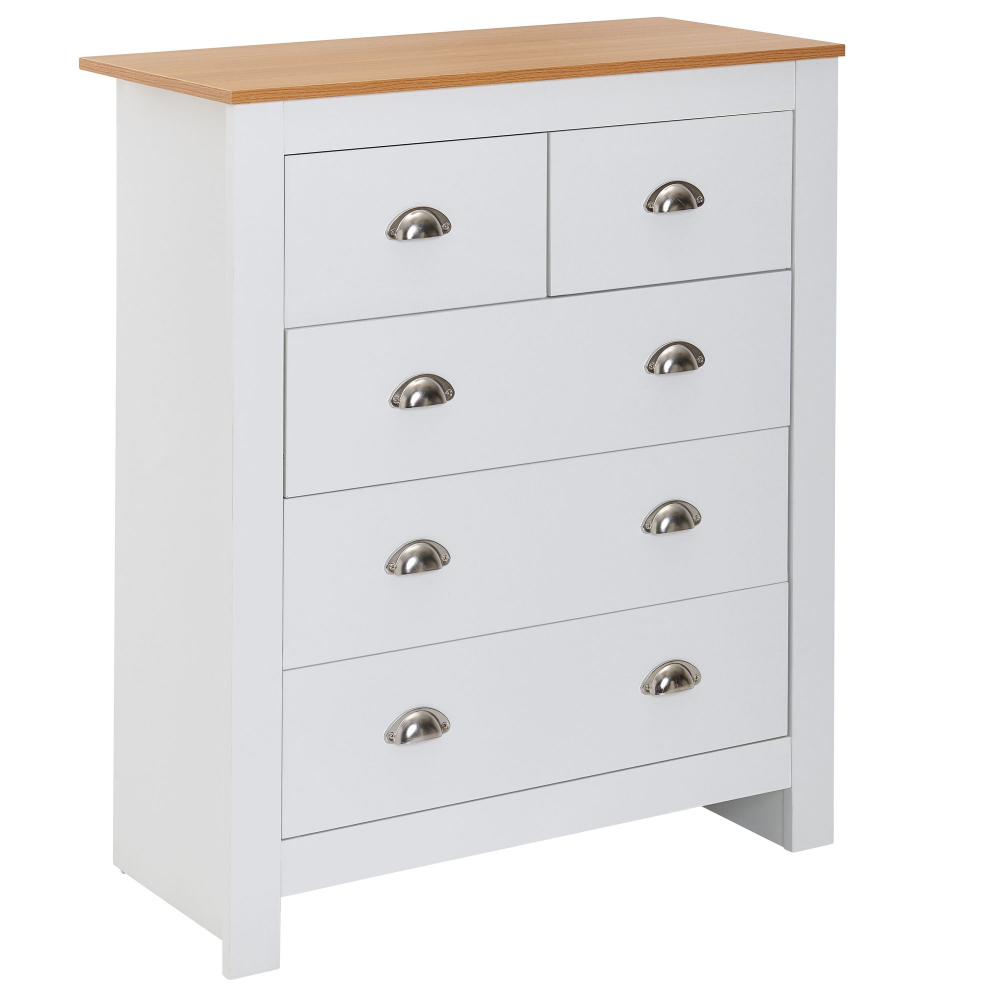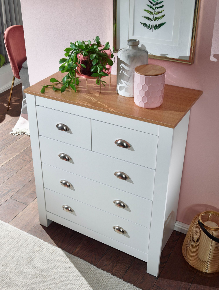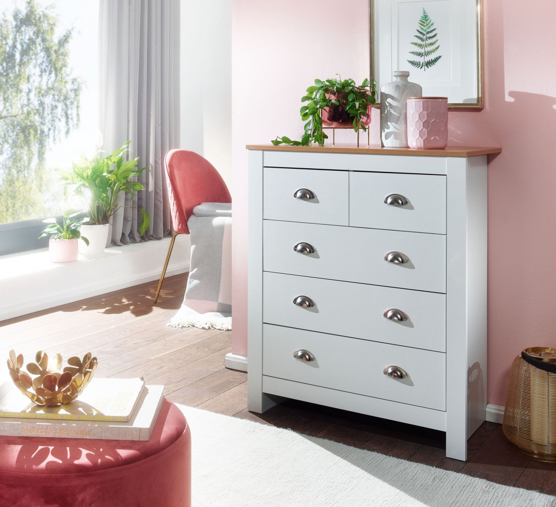 Komoda Miranda v bílé barvě je vyrobená z dřevotřískové desky a stane se jedinečným a stylovým doplňkem vašeho moderního, ale i klasického interiéru. Komoda nabízí úložný prostor díky 5 zásuvkám. Atraktivní kontrast dodává horní deska komody, která je zanechaná v přírodním odstínu.