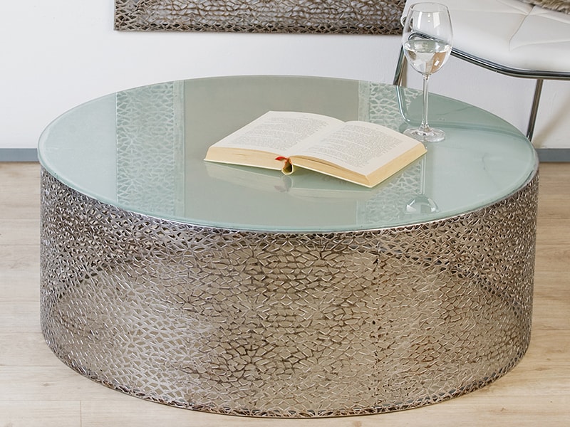 Kulatý konferenční stolek Purley průměru 80 cm se hodí do interiérů zařízených stylovým nábytkem, ale také do moderních interiérů. Kovový korpus je provedený ve starožitné stříbrné barvě, zatímco zástupcem moderního stylu je kulatá stolová deska ze satinovaného skla. Toto spojení starožitného a moderního vytváří napětí, které však ve výsledku působí velmi harmonickým dojmem.