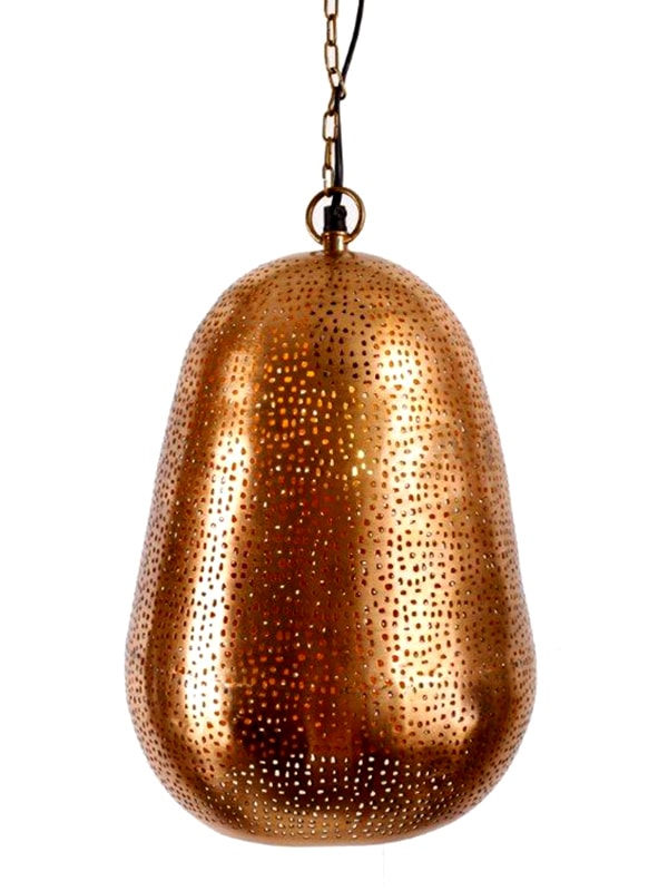 Lustr Colly je celokovový. Jeho stínidlo má hruškovitý tvar a je proděravěné spoustou malých otvorů, kterými prosvítá světlo žárovky. Navíc je lustr opatřený také kovovým řetězem pro zavěšení. Bude se hodit k nábytku a doplňkům v industriálním stylu.