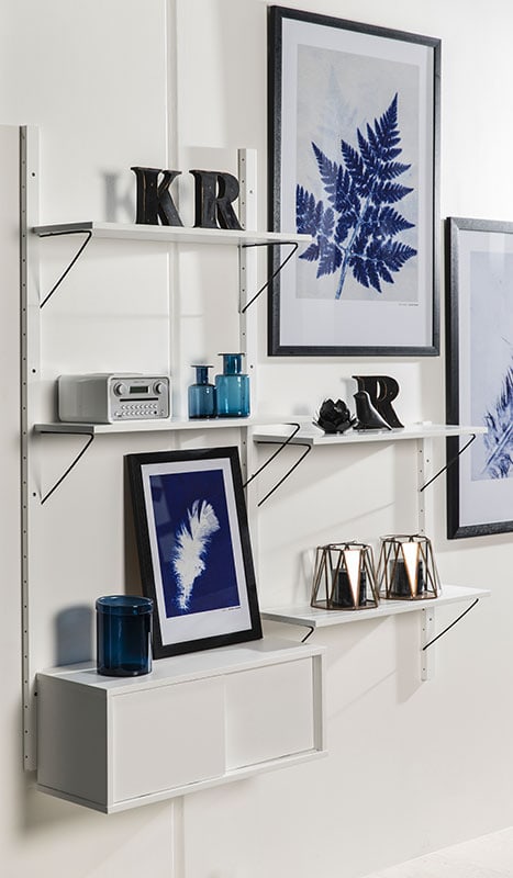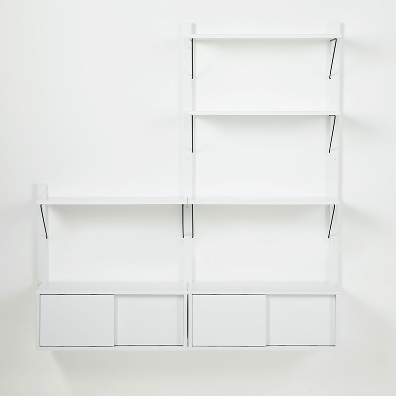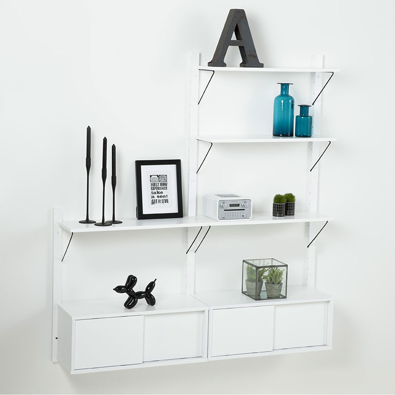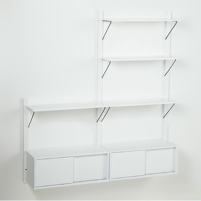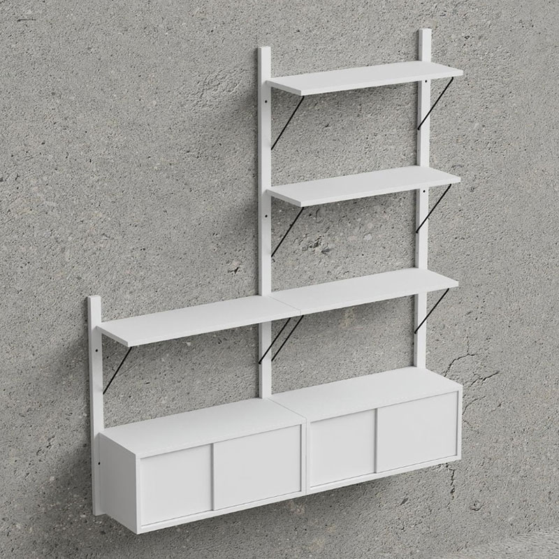 Nástěnný policový systém Dellan je univerzální úložný prostor, který si snadno přizpůsobíte vlastním potřebám. V balení obdržíte všechny prvky potřebné k sestavení zobrazené sestavy, která obsahuje 2 skříňky s posuvnými dveřmi a 4 police zavěšené na nástěnných lištách. Neváhejte si však uvedené prvky sestavit v jiné kompozici, lišty a závěsné prvky jsou totiž modulární. Policový systém lakovaný matným bílým lakem je elegantní a současně velmi neutrální a bude se hodit do moderního i tradičněji zařízeného interiéru.