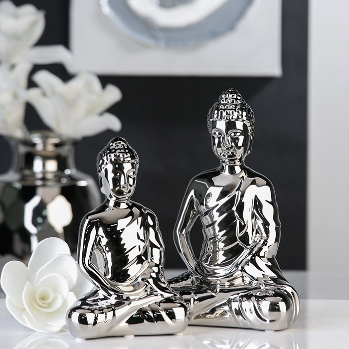 Keramická soška Buddhy v tradiční meditační pozici je oblíbeným doplňkem pro harmonický interiér.